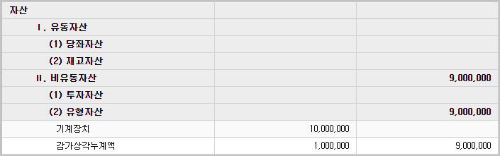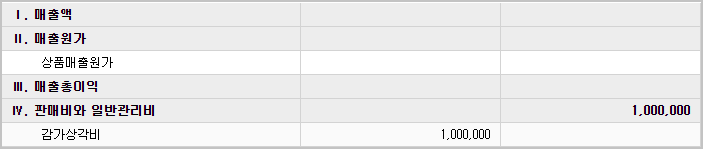 | 감가상각비 1,000,000 | 감가상각누계액 1,000,000 (기계장치, 차량운반구 등 각 자산에 대한 감가상각누계액 계정) |