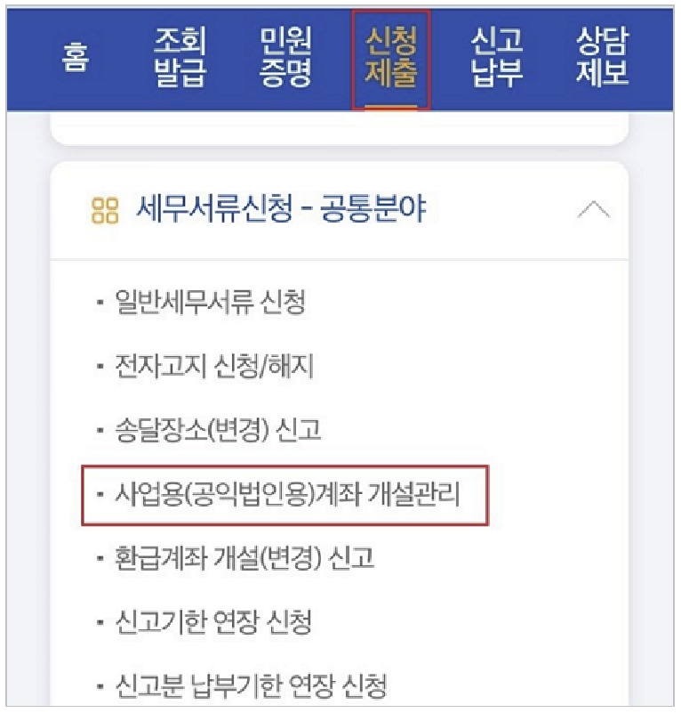 홈택스에 로그인 ▷ 신고/납부 ▷ 일반신고 ▷ 사업용(공익법인전용) 계좌 개설