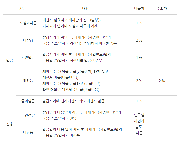 | 미전송 | 전자세금계산서 발급의무자 | 0.3% | 1% | 1% | 1% |